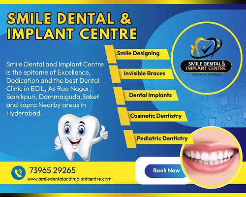 Dental fear affects many people. It stops them from getting the care they need. At Smile Dental and Implant Centre in Secunderabad, you can end that fear. This top clinic sits right near you. It offers gentle treatments to build your trust. Fear of the dentist often comes from past bad visits. Or it stems from stories you heard. About half of adults feel some worry at the dentist. This can lead to skipped checkups. Poor oral health follows. Smile Dental changes that. Their team uses calm methods. They explain each step clearly. The clinic focuses on implants and full dental care. Trained experts handle everything with care. They use modern tools that reduce pain. No more drills that scare you. Instead, quick and easy options wait. Patients leave feeling relaxed and happy. Why pick this spot in Secunderabad? It ranks as the best for a reason. Local folks have trusted it for years. Reviews show high praise for the kind staff. If pain or worry holds you back, call today. Start your smile journey without fear. Smile Dental and Implant Centre stands out as a leading dental clinic in Secunderabad. It serves patients with painless treatments that ease any fear of visits to the dentist. The clinic also keeps costs low so more people can get the care they need without breaking the bank. Located right in the heart of Secunderabad, it reaches neighborhoods like Kapra, ECIL, AS Rao Nagar, Dammiguda, and Sainikpuri. Families in these areas trust the team for routine checkups, cleanings, fillings, and even advanced implant work. Painless care often means using gentle tools and numbing agents that work fast. Affordable options include packages for basic services starting at rates well below city averages. This setup helps busy locals avoid long trips while getting quality results. The clinic's skilled dentists focus on clear explanations and quick procedures to build lasting patient confidence. Book an Appointment now. More Details, visit: https://smiledentalandimplantcentre.com/ Invisalign Offer: https://smiledentalandimplantcentre.com/get-up-to-50-off-on-invisalign-teeth-aligners-at-smile-dental-and-implant-centre-in-as-rao-nagar-secunderabad/ For an Appointment, Call +91-9490618635, +91-9490618636. Check our Google Reviews and Directions: https://maps.app.goo.gl/wQ6t3GwnsLNUPP5Y8 Location: 1st floor, K Rathod Jewellers, Besides Honey Foods near Kapra Circle, Saket Road-Kapra, Ecil. ![]() | |