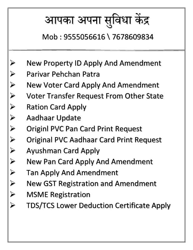 New Property Id Apply And Ammendment . Property Tax Payment Parivar Pehchan Patra - Government Of Haryana (i) Address Correction Request in PPP (ii) Bank Details Update in PPP (iii) Family Members Details Update and Correction PPP (iv) New Member Add in PPP New Voter Card Apply, Voter Card Ammendment Voter Transfer Request From Other State. Ration Card Apply New Pan Card Apply, Correction (Company & Individual) Originl PVC Pan Card Print Request (Company & Individual) Original PVC Aadhar Card Print Request Aadhar card only Address update New Gst Apply and correction. Tan Apply And Correction. Ayushman Card Apply MSME registration /Udyam Registration or more please write me https://wa.me/9555056616 Email. banalata.creations@gmail.com ![]() | |