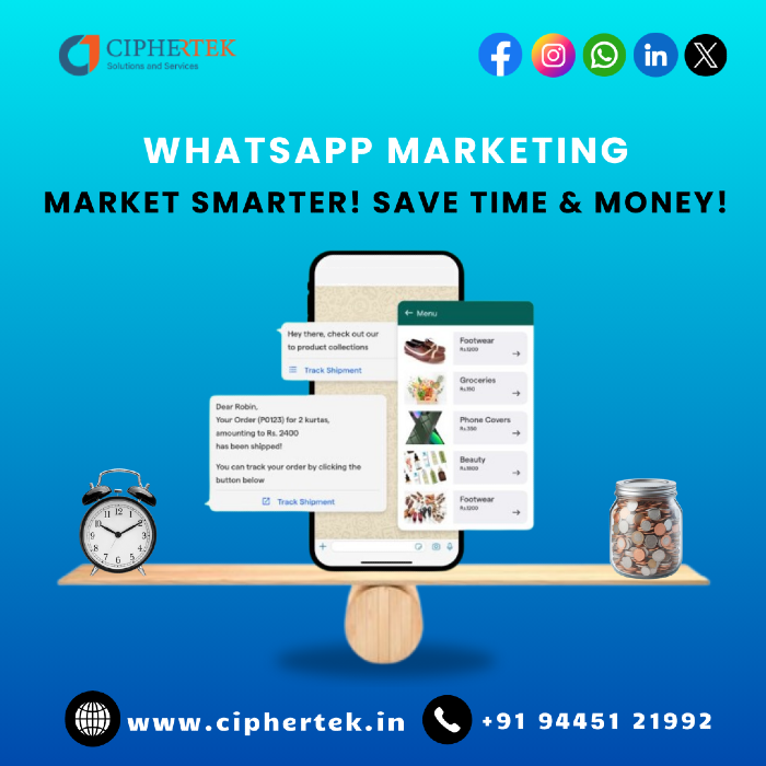 Boost Your Business with Ciphertek on WhatsApp | WhatsApp Marketing Services in Chennai. Ciphertek offers expert WhatsApp marketing solutions in Chennai. Leverage direct messaging to share promotions, updates, and personalized campaigns with your audience. ![]() | |