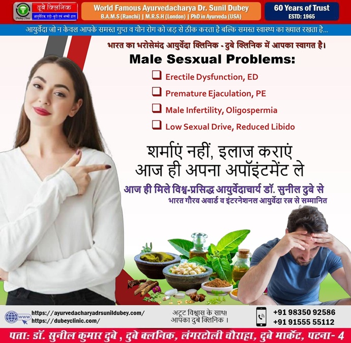 Free Online Advertising Free Internet Web Site Advertising. UK Free Classifieds United Kingdom Free Ads Website. 100% Free Ad Posting. Canada Free Ads Popular Online Classifieds in Canada. No Sign up, No Email Required to Post. World-renowned Ayurvedacharya Dr. Sunil Dubey, one of the best sexologists in Patna, Bihar, says that erectile dysfunction is a physical sexual disorder in men. Many factors, including physical and medical factors, side effects of certain medications, hormonal changes, neurological problems, poor lifestyle habits, and mental health issues, play a role in this sexual problem. Only Ayurveda offers safe, effective, and cause-based treatments for all types of erectile dysfunction. He provides his comprehensive and medically proven treatment and non-medical support to each and every sexual problem at Dubey Clinic. In this session, we would know how this senior clinical sexologist treats the erectile dysfunction patient. Dr. Sunil Dubey's treatment method for erectile dysfunction: As we know, erectile dysfunction is a common condition in which a man is unable to achieve or maintain an erection sufficient for satisfactory sexual intercourse. Several conditions, including vascular, psychological, neurogenic, hormonal, and drug-induced, are responsible for this sexual dysfunction in men. Dr. Sunil Dubey helps patients understand the exact cause of erectile dysfunction. To do this, he examines the underlying physical, medical, and psychological conditions that directly and indirectly affect sexual health and function. His approach to treating erectile dysfunction (ED) is primarily based on Ayurveda and naturopathy, emphasizing holistic and natural treatment methods. Key components of his treatment protocol for Erectile Dysfunction: Ayurveda Medicine and Herbal Treatment: His sexual treatment is based on Ayurvedic medicines and herbal remedies. It is said to be 100% effective and permanent properties without any side effects. Specific natural ingredients include: Herbs (natural Bhasma, Churna, and Tablets): Use of natural herbal formulations. Individual Treatment: Use of mineral or metal formulations traditionally used in Ayurveda for personalized treatment. Natural oils and chemicals: Possibly referring to topical Ayurvedic formulations. Ayurvedic proprietary medicines: Special Ayurvedic formulations for sexual health. Comprehensive Diagnosis and Health Assessment: Dr. Dubey, the best sexologist in Bihar, India emphasizes understanding the root cause of the problem by identifying various contributing factors, which may include: Physical causes: Conditions such as diabetes, high blood pressure, heart and blood vessel diseases, chronic kidney disease, and injury. He says that physical causes are responsible for erectile dysfunction in about 80% of cases in different age-group of people. Psychological and emotional factors: Stress, anxiety, guilt, low self-confidence, fear of poor sexual performance, and relationship conflict affect sexual health in an indirect way. Lifestyle factors: Habits such as smoking, excessive alcohol consumption, poor diet, being overweight, and lack of physical activity affect not only sexual health but also overall health. Medication-related causes: Some allopathic medications (e.g., for blood pressure, prostate cancer, or depression) can sometimes cause erectile dysfunction. Psychological and behavioral therapy: As we know that mental health issues affect sexual health in an indirect way where a person also struggles with his poor life style. Here, recognizing the psychological component of sexual health, their treatment may also include: Sexual counseling: Providing guidance and support. Cognitive behavioral therapy (CBT): A type of psychotherapy that helps patients change negative thinking patterns. Anti-Anxiety therapy (AAT): Therapy focused on managing anxiety related to sexual performance. Health guidance: Suggestions for irregular routines and unbalanced diets. Lifestyle and Home Remedy Guidance: He also recommends dietary and lifestyle modifications to support Ayurvedic treatment, and suggests: Specific foods: Foods rich in flavonoids (such as blackberries), lycopene (such as watermelon, tomatoes), folate (such as spinach), and L-arginine (such as oatmeal, nuts, and peanuts) are recommended to help improve blood flow. Avoiding harmful habits: such as excessive smoking and drinking. Follow routine: He suggests people to follow both daily and seasonal routine to maintain a healthy lifestyle. In short, Dr. Sunil Dubey integrates traditional Ayurvedic medicine with counselling and lifestyle advice to provide holistic treatment for erectile dysfunction. He always focuses on balancing the doshas in body which directly or indirectly affects the sexual health and wellness. ![]() | |