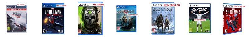 New PlayStation Games NEED FOR SPEED { NFS RIVALS } PS4 GAME - 3950.00 NEED FOR SPEED { UNBOUND} PS5 GAME - 4000.00 FC 25 PS4 GAME - 4500.00 Ghost of Tsushima 4 PS4 GAME - 4500.00 Marvels SpiderMan Miles Morales 4 PS4 GAME - 4500.00 Call of Duty Modern Warfare 2 PS5 GAME - 5500.00 God Of War PS4 GAME - 5500.00 FC 25 PS5 GAME - 5900.00 God Of War PS5 GAME - 5950.000 Marvels Spiderman 2 PS5 GAME - 7500.00 CONTACT : 0786 178372 or 0726 178372 LOCATION : Shop 501 (5th floor), Veteran House (Graffins college) Moi avenue, Nairobi Kenya ![]() | |