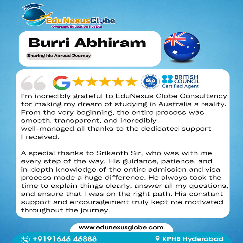 "I’m incredibly grateful to EduNexus Globe for making my dream a reality." Hear from Burri Abhiram how our smooth process and expert guidance, especially from Srikanth Sir, made his study abroad journey a success. Ready to start yours? Location: Hyderabad, Telangana Email: info@edunexusglobe.com Website: http://www.edunexusglobe.com Phone: +91-9966111337 #bestoverseaseducationconsultantsinhyderabad #bestoverseaseducationconsultantsinhyderabadforusa #bestoverseaseducationconsultantsinhyderabad #bestoverseaseducationconsultantsinhyderabadreviews #top10overseaseducationconsultantsinhyderabad #besteducationalconsultantsinhyderabad #overseasconsultancyinhyderabad #bestconsultancyinhyderabadformsinusa #listofoverseaseducationconsultantsinhyderabad #bestoverseaseducationconsultantsinhyderabadforcanada #bestoverseasconsultantsinhyderabad #bestoverseaseducationconsultantsinandhrapradesh #top10bestoverseaseducationconsultantsinandhrapradesh #bestoverseaseducationconsultantsinvisakhapatnam #bestoverseaseducationconsultantsinvijayawada #overseaseducationconsultantsinvizag #besteducationalconsultantsinvijayawada #bestoverseaseducationconsultantsinguntur #bestoverseaseducationconsultantsinhyderabadreviews #onlineclassesbestoverseaseducationconsultantsinhyderabad #ukstudyconsultancyinhyderabad #bestconsultancyinhyderabadforstudyabroad #bestconsultancyforuseducationinhyderabad #bestconsultancyinhyderabadforcanadastudentvisa #abroadstudyplanconsultancyinhyderabad #bestukstudentvitags:saconsultantsinhyderabad #bestconsultancyinhyderabadformbaabroad #bestukstudentvisaconsultantsinhyderabad ![]() | |