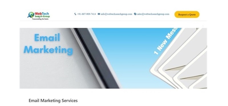 Are you looking for Email marketing services? We are here to unravel all your dilemmas related to Email Marketing in no time, you need to begin with WebTech Search Email Marketing Service to get the advancement in your business and a smile on your face, we serve favourable and decent ideas and strategies for your brand. Email Marketing is a successive marketing technique that puts your customer on the priority and this transforms you into an honest and valuable marketer. We construct Email Marketing concepts and formulate targeted and personalized mail to build vital alliances with your consumers. For more details Phone: +91-807-909-7414 Email: info@webtechsearchgroup.com Address: RZF-926, Raj Nagar Part-2, Dwarka New Delhi-110077 Website: https://webtechsearchgroup.com/ ![]() | |