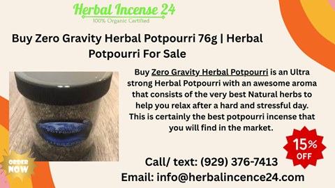 | Zero Gravity Herbal Potpourri 76g is a premium blend of natural herbs and botanicals designed to provide a refreshing and long-lasting fragrance. Unlike ordinary potpourri, it is crafted with carefully selected ingredients that release a unique aroma, making it perfect for relaxation, meditation, and enhancing the ambiance of any space. Call/ text: (929) 376-7413 Email: info@herbalincence24.com  | |