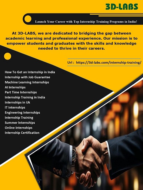 Looking for how to get an internship in India that actually boosts your career? 3D‑LABS offers comprehensive internship training in India and the UK, with online, summer, and part-time internships across engineering, IT, AI, and machine learning. Our programs are designed for students, freshers, and job-seekers who want real project experience, expert mentorship, and internship certification. We provide engineering internships, IT internships, machine learning internships, and AI internships, all guided by industry professionals. With over 21 years of experience, 3D‑LABS ensures practical learning, resume support, LinkedIn portfolio guidance, and even internship with job guarantee options based on performance. Whether you’re looking for internships in UK or India, our flexible formats—including remote and part-time options—make it easy to gain hands-on skills from anywhere. Apply now to join our internship training program and take the first step toward a successful professional future. ![]() | |