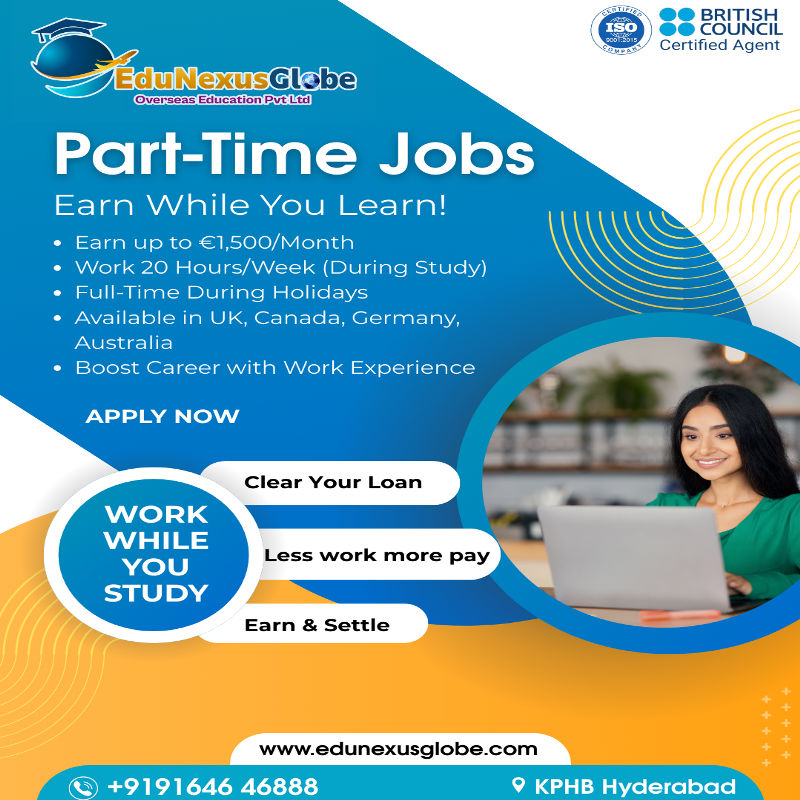 At EduNexus Globe, we believe that studying abroad is not just about education – it is about building a complete life experience that empowers your future. One of the greatest advantages of studying overseas is the ability to work part-time while you learn, and EduNexus Globe is here to guide you through every step of the process. International students can earn up to €1,500 per month through part-time work opportunities, making education more affordable and financially stress-free. During your academic sessions, you can work up to 20 hours per week, and during semester breaks or holidays, you can work full-time – helping you cover living expenses, tuition, and even save for future goals. These work opportunities are available in some of the most sought-after destinations such as the UK, Canada, Germany, and Australia, giving you the freedom to choose where you want to build your career. Working while studying not only provides financial stability but also enhances your resume with global work experience. Employers worldwide value candidates who have international exposure, time management skills, and hands-on experience in their field. By combining study and work, you can graduate with both a degree and practical industry knowledge, giving you a strong edge in today’s competitive job market. EduNexus Globe offers complete support – from helping you choose the right destination and university to guiding you with part-time job rules, work permits, and compliance with local labor laws. Our British Council-certified and ISO 9001:2015-certified services ensure you receive the highest quality guidance, making your international journey seamless and stress-free. With EduNexus Globe by your side, you can earn while you learn, clear your educational loan faster, gain independence, and confidently work toward building a bright and successful future. Location: Hyderabad, Telangana Phone: +91-9966111337 Website: http://www.edunexusglobe.com Email: info@edunexusglobe.com #bestoverseaseducationconsultantsinhyderabad #bestoverseaseducationconsultantsinhyderabadforusa #bestoverseaseducationconsultantsinhyderabad #bestoverseaseducationconsultantsinhyderabadreviews #top10overseaseducationconsultantsinhyderabad #besteducationalconsultantsinhyderabad #overseasconsultancyinhyderabad #bestconsultancyinhyderabadformsinusa #listofoverseaseducationconsultantsinhyderabad #bestoverseaseducationconsultantsinhyderabadforcanada #bestoverseasconsultantsinhyderabad #bestoverseaseducationconsultantsinandhrapradesh #top10bestoverseaseducationconsultantsinandhrapradesh #bestoverseaseducationconsultantsinvisakhapatnam #bestoverseaseducationconsultantsinvijayawada #overseaseducationconsultantsinvizag #besteducationalconsultantsinvijayawada #bestoverseaseducationconsultantsinguntur #bestoverseaseducationconsultantsinhyderabadreviews #onlineclassesbestoverseaseducationconsultantsinhyderabad #ukstudyconsultancyinhyderabad #bestconsultancyinhyderabadforstudyabroad #bestconsultancyforuseducationinhyderabad #bestconsultancyinhyderabadforcanadastudentvisa #abroadstudyplanconsultancyinhyderabad #bestukstudentvisaconsultantsinhyderabad #bestconsultancyinhyderabadformbaabroad #bestukstudentvisaconsultantsinhyderabad ![]() | |