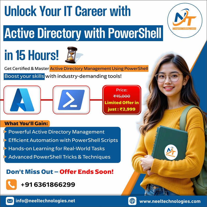 Mastering Active Directory helps you manage users, computers, and network resources efficiently, while PowerShell lets you automate these tasks with ease. Together, they boost your productivity, reduce errors, and prepare you for high-demand IT roles like System Admin, IT Support, and DevOps. Automate IT tasks Manage networks smartly Boost your career with in-demand skills Get hands-on with real-world scenarios Get Certified | Industry-relevant skills | Hands-on Learning For more Call Us: +91 6361866299 Mail Us: info@neeltechnologies.net Address: Doddabele Kengeri Bangalore - 560040 Visit Us: https://neeltechnologies.com/ ![]() | |