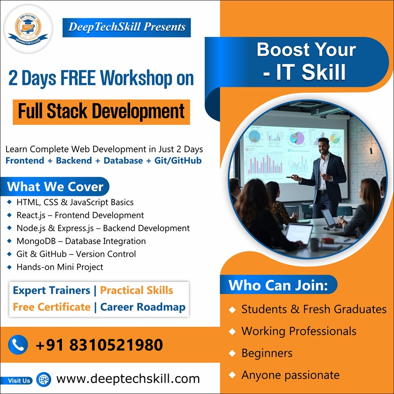 Unlock your career potential with our Full Stack Development training program designed to make you job-ready in today’s competitive IT industry.This course covers everything from frontend technologies like HTML, CSS, JavaScript, and React, to backend development with Node.js, Express, and databases such as MySQL and MongoDB. Learn Full Stack Development and master both frontend & backend technologies with hands-on projects. Build real-world web applications and boost your IT career with expert guidance and placement support. Expert Trainers | Practical Skills | Free Certificate | Career Roadmap Who Can Join? Students & Fresh Graduates Working Professionals Beginners Anyone passionate about IT Limited seats available! Register today: Call: +91 8310521980 Mail Us: info@deeptechskill.com Address: Doddabele Kengeri Bangalore - 560040 Visit: www.deeptechskill.com ![]() | |
