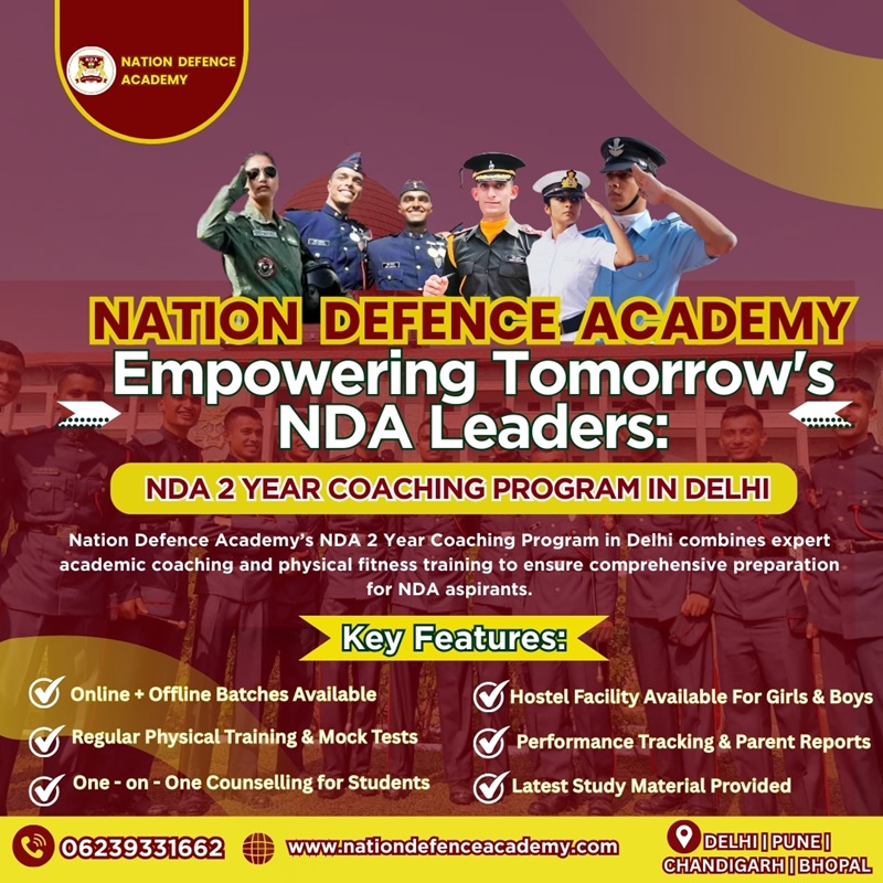 Nation Defence Academy offers the best NDA 2 Year Coaching Program in Delhi for students aspiring to join the Indian Armed Forces. This program is designed for Class 11 and 12 students who want to prepare for NDA while continuing their school studies. With expert faculty, detailed syllabus coverage, regular tests, and physical training sessions, students gain both academic and defence-oriented guidance. Nation Defence Academy focuses on discipline, confidence, and complete personality development to ensure success in written exams and SSB interviews. Join the trusted institute in Delhi for assured progress toward your NDA career. Contact us: Nation Defence Academy Our branches: Delhi, Pune, Bhopal, Chandigarh Visit:https://nationdefenceacademy.com/nda-coaching.php ![]() | |