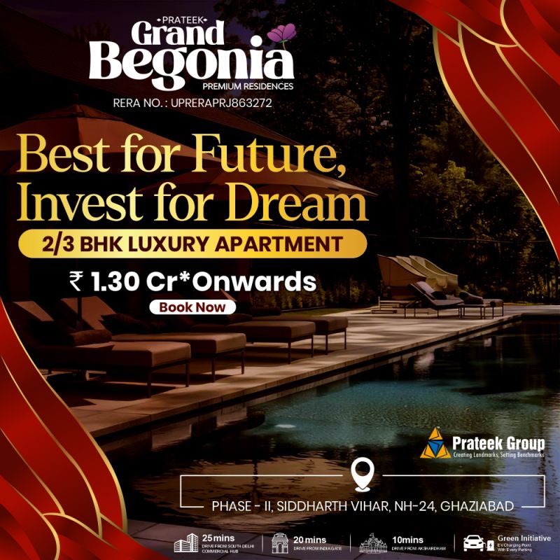 A premium residential project, Prateek Grand Begonia, is an under-construction real estate site in Siddharth Vihar, which is called the Phase II development by Prateek Group in the same location after the success of the Phase I residential project. This is 2/3BHK apartments with 40 acres of integrated township, seamless connectivity, a sideline of green and clean nature, the beauty of vast landscapes and hardscape, EV charging, etc. Prateek Grand Begonia is available for booking, and the total price to be paid is 1.30 Cr* only! RERA No: UPRERAPRJ863272/09/2024. ![]() | |