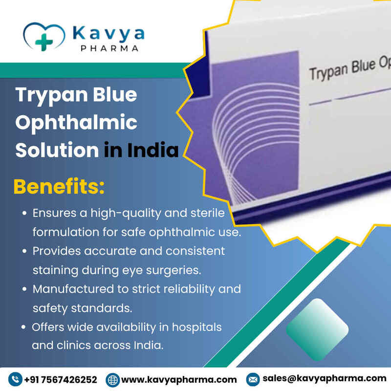 Kavya Pharma is one of the leading Trypan blue ophthalmic solution manufacturers in India, known for producing safe, effective, and high-quality ophthalmic products. We ensure every formulation adheres to international safety standards and precision with modern manufacturing facilities. We are committed to providing innovative solutions that empower healthcare professionals to deliver better patient care. Our focus on quality, reliability, and customer satisfaction makes us a preferred partner in the pharmaceutical industry. Contact Kavya Pharma today to experience excellence in ophthalmic product manufacturing and dependable service. Our Services: ⦁ Speciality Chemicals ⦁ Turkey Red Oil ⦁ Castor Oil ⦁ Tolu hydroquinone (THQ) manufacturers ⦁ Trypan Blue Ophthalmic Solution Manufacturers ⦁ Gadodiamide 10 mL injection ⦁ Sulphonated castor oil ⦁ TRO Sulphonated Castor Oil ⦁ 2,3-Lutidine manufacturers For More Information: Call: +91 7567426252 Address: Kavya Pharma, Shop No.215,Raj Mandir Complex, Aai Mata Road,Parvat Patiya, Surat, Gujarat-395010 Email: sales@kavyapharma.com Website: https://www.kavyapharma.com ![]() | |