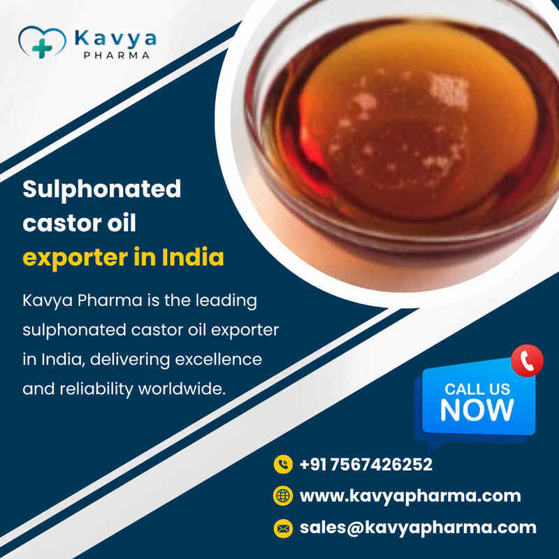 Kavya Pharma stands among the most reliable sulphonated castor oil exporters in India, dedicated to offering premium-quality products that adhere to international standards. We provide reliable and consistent chemical solutions for a wide range of industrial applications. Our expert team conducts detailed quality checks on every batch to ensure purity, performance, and customer satisfaction. We continue to lead with innovation and excellence with an efficient supply chain, timely delivery, and a strong global footprint. Contact Kavya Pharma today for superior sulphonated castor oil and exceptional service you can rely on. Our Services: ⦁ Speciality Chemicals ⦁ Turkey Red Oil ⦁ Castor Oil ⦁ Tolu hydroquinone (THQ) manufacturers ⦁ Trypan Blue Ophthalmic Solution Manufacturers ⦁ Gadodiamide 10 mL injection ⦁ Sulphonated castor oil ⦁ TRO Sulphonated Castor Oil ⦁ 2,3-Lutidine manufacturers For More Information: Call: +91 7567426252 Address: Kavya Pharma, Shop No.215,Raj Mandir Complex, Aai Mata Road,Parvat Patiya, Surat, Gujarat-395010 Email: sales@kavyapharma.com Website: https://www.kavyapharma.com ![]() | |