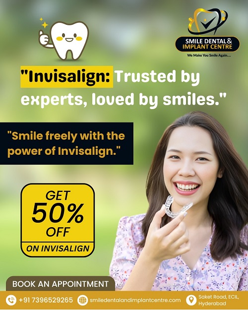 Invisalign aligners offer a clear way to straighten teeth without metal braces. Many people in Hyderabad seek this option for a discreet smile fix. The cost of Invisalign treatment in the city starts around 1.5 lakh rupees. It can go up to 3.5 lakh rupees or more, based on your needs. What sets Invisalign apart? These are custom plastic trays that fit over teeth. You swap them every few weeks as your teeth shift. Unlike braces, they stay hidden and easy to remove for meals or cleaning. Dentists in Hyderabad often pair them with check-ups to track progress. Several factors drive the price. Your age plays a role; adults pay more than kids due to complex cases. The treatment length matters too—simple fixes take six months, while tough ones need two years. Add-ons like attachments or extra trays bump up the bill. In Hyderabad, clinics in areas like Banjara Hills or Jubilee Hills charge a bit higher for top service. Local spots in Secunderabad might offer deals to attract patients. Always get a free consult first. A dentist scans your teeth and shares a custom plan with exact costs. Patients report great results. One expert from a Hyderabad dental group notes, "Invisalign cuts down on pain and visits compared to wires." Stats show over 80% of users finish on time if they wear trays 20-22 hours daily. This treatment changes lives by boosting confidence. If crooked teeth bother you, explore Invisalign costs in Hyderabad today. Invisalign Cost at Smile Dental and Implant Centre At Smile Dental and Implant Centre in Kapra, Secunderabad, Invisalign treatment costs range from Rs. 50,000 to Rs. 2, 50,000. This clear aligner system straightens teeth without traditional braces. It uses custom-made trays that patients swap out every few weeks. The clinic offers free consultations to discuss your smile goals. They also provide free scanning to map your teeth precisely. Plus, enjoy up to 60% off on select packages, making quality care more affordable. If you search for top Invisalign providers in Hyderabad, head straight to Smile Dental and Implant Centre. Their team handles cases from mild spacing issues to complex bite problems. For example, many patients fix crowded teeth or gaps with these invisible aligners. The process starts with a simple exam, and then moves to treatment planning. No wires or brackets mean less hassle in daily life. Orthodontists here bring over 15 years of hands-on experience. They guide you through each step with care. This expertise ensures results that last. Patients often leave with straighter smiles and boosted confidence. Ready to improve your teeth? Book an appointment today. Call or visit to start your journey. For an Appointment, Call +91-7396529265, +91-9490618635, +91-9490618636. More Info Visit our Website: https://smiledentalandimplantcentre.com/invisible-braces-cost-in-hyderabad/ Invisalign Offer: https://smiledentalandimplantcentre.com/get-up-to-50-off-on-invisalign-teeth-aligners-at-smile-dental-and-implant-centre-in-as-rao-nagar-secunderabad/ Check our Google Reviews and Directions: https://maps.app.goo.gl/wQ6t3GwnsLNUPP5Y8 Location: 1st floor, K Rathod Jewellers, Besides Honey Foods near Kapra Circle, Saket Road-Kapra, Ecil. ![]() | |