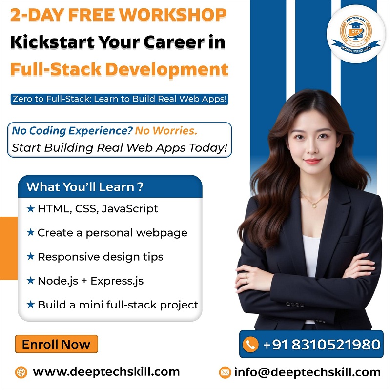 Deep Tech Skill’s Full Stack Development course in Bangalore is designed to transform you into a job-ready developer capable of building end-to‐end web applications—covering front‐end basics (HTML5, CSS3, JavaScript) through modern frameworks like React/Angular, backend with Node.js/Express, databases (MongoDB/MySQL), version control (Git/GitHub) and deployment tools.Join Deep Tech Skill in Bangalore for an in-depth full stack web developer course—learn both front and back ends, build live projects, deploy apps, and get guided on portfolio building and interview prep. Expert Trainers | Practical Skills | Free Certificate | Career Roadmap Who Can Join? Students & Fresh Graduates Working Professionals Beginners Anyone passionate about IT Limited seats available! Register today: Call: +91 8310521980 Mail Us: info@deeptechskill.com Address: Doddabele Kengeri Bangalore - 560040 Visit: www.deeptechskill.com ![]() | |