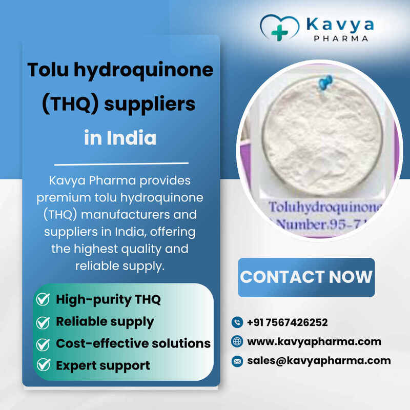 Kavya Pharma specializes in tolu hydroquinone (THQ) manufacturers and suppliers in India, offering premium-quality chemical products that meet international standards. We produce a high-purity THQ widely used across the pharmaceuticals, cosmetics, and chemical industries. Our advanced production facilities and rigorous quality checks ensure safety, consistency, and superior performance in every batch. We provide timely deliveries and cost-effective solutions with a focus on innovation, sustainability, and client satisfaction. Contact Kavya Pharma today for exceptional Tolu Hydroquinone (THQ) manufacturing and supply services. Our Services: ⦁ Speciality Chemicals ⦁ Turkey Red Oil ⦁ Castor Oil ⦁ Tolu hydroquinone (THQ) manufacturers ⦁ Trypan Blue Ophthalmic Solution Manufacturers ⦁ Gadodiamide 10 mL injection ⦁ Sulphonated castor oil ⦁ TRO Sulphonated Castor Oil ⦁ 2,3-Lutidine manufacturers For More Information: Call: +91 7567426252 Address: Kavya Pharma, Shop No.215,Raj Mandir Complex, Aai Mata Road,Parvat Patiya, Surat, Gujarat-395010 Email: sales@kavyapharma.com Website: https://www.kavyapharma.com ![]() | |