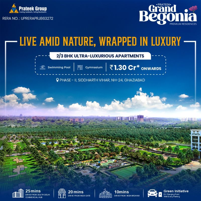 | Prateek Grand Begonia is the luxury project in Ghaziabad where it invites to buy 2 BHK, 3 BHK luxury Apartments in Siddharth Vihar, Ghaziabad with fully modern also get amenities included swimming pool, club, park, parking, jogging track etc. Prateek Grand Begonia Ghaziabad connectivity to Delhi-Meerut Expressway, NH24, Noida etc. This project offers those seeking an elevated lifestyle, serene environment with greenery surrounding, as well as makes an ideal choice of home buyers. The price starts from 1.30 Cr* only! RERA No: UPRERAPRJ863272/09/2024.  | |