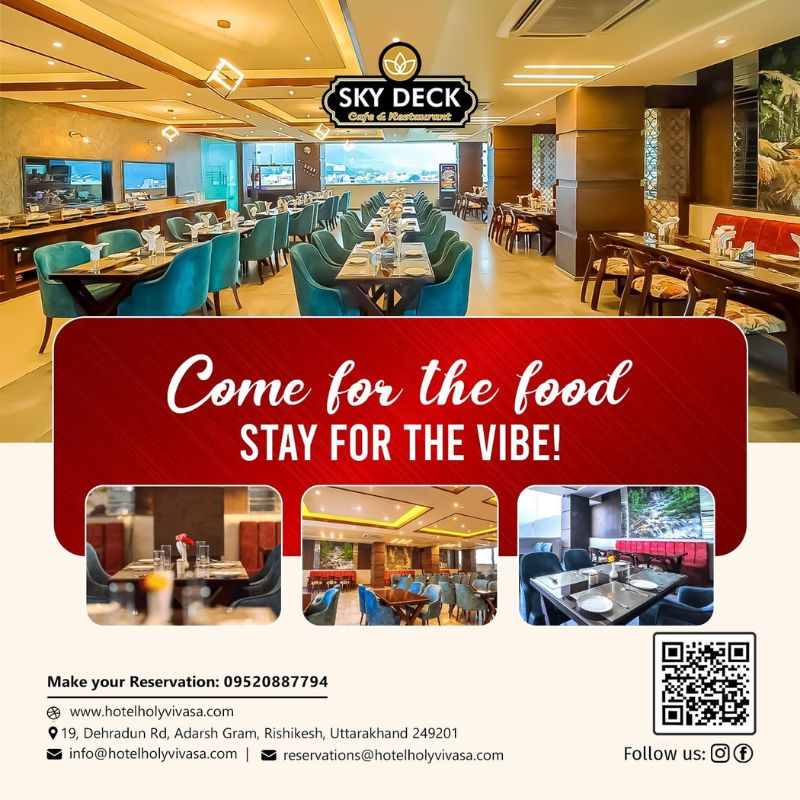 Experience breathtaking views and exceptional dining at Sky Deck Restaurant, the stunning rooftop restaurant of Hotel Holy Vivasa. Overlooking the scenic hills and tranquil Ganga, Sky Deck offers a perfect blend of delicious cuisine, romantic ambiance, and modern comfort. Whether it’s a sunset dinner or a relaxing evening with friends, this rooftop haven is ideal for every occasion. Visit Hotel Holy Vivasa, Rishikesh, and make your meal an unforgettable experience under the open sky. ![]() | |
