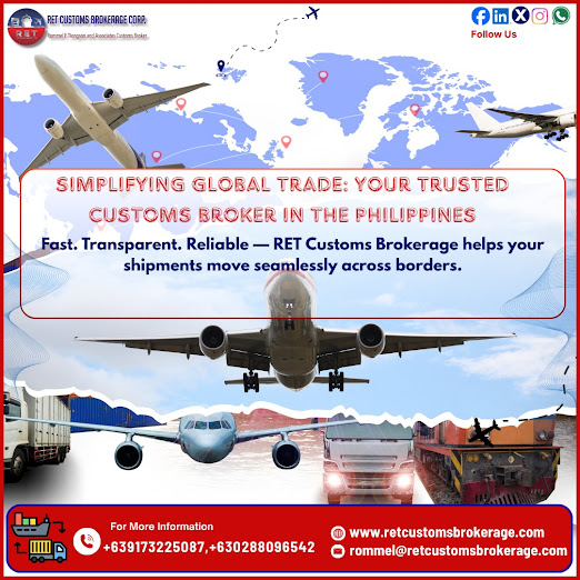 Looking for seamless freight forwarding? RET provides integrated shipping solutions — by air, sea, and land — with documentation support, carrier negotiation, transparent pricing, and door-to-door delivery across the Philippines. Contact: RET Customs Brokerage Corp. Unit 227 Makati Executive Tower 3, Gil Puyat Ave, Brgy Pio Del Pilar, Makati City 1230, Philippines Phone: (+63) 2‑8809‑6542 Email: rommel@retcustomsbrokerage.com ![]() | |